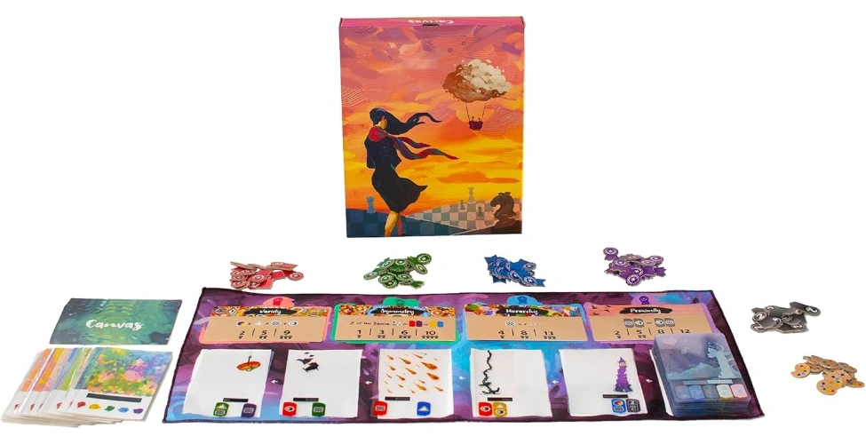 In Canvas, players stack clear art cards to form beautiful paintings with different scoring combinations. You choose which cards to take and how to layer them to craft the best final piece.
